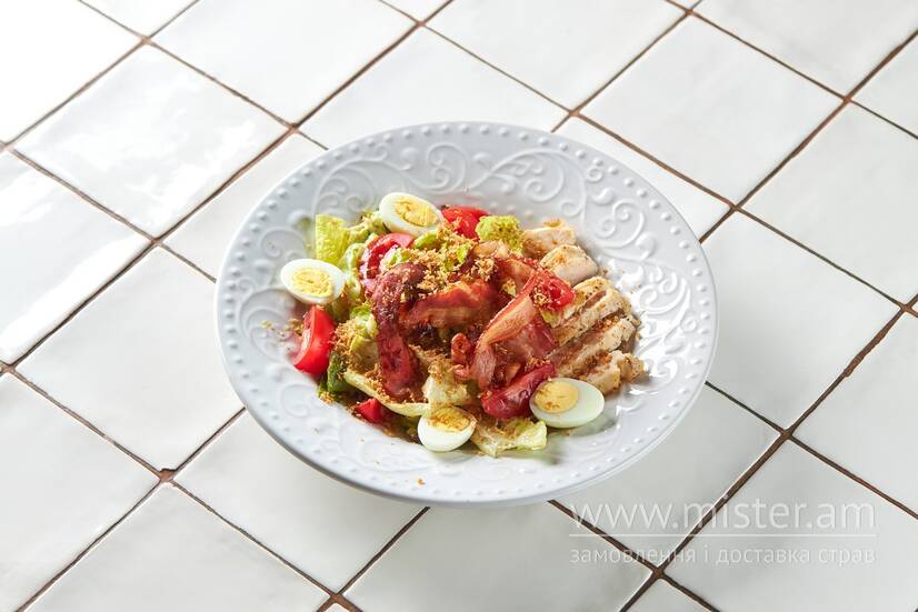 Філе куряче, томати чері, перепелині яйця, сухарі Пангратто, мікс салатів (айсберг та ромен), панчета, пармезан, соус Цезар з базиліком.
