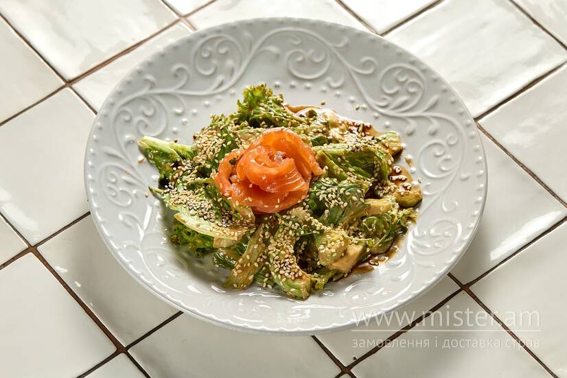 Лосось гравлакс, авокадо, огірки, мікс салату, соус горіховий, сезам (кунжут), соус теріякі, в`ялені томати.