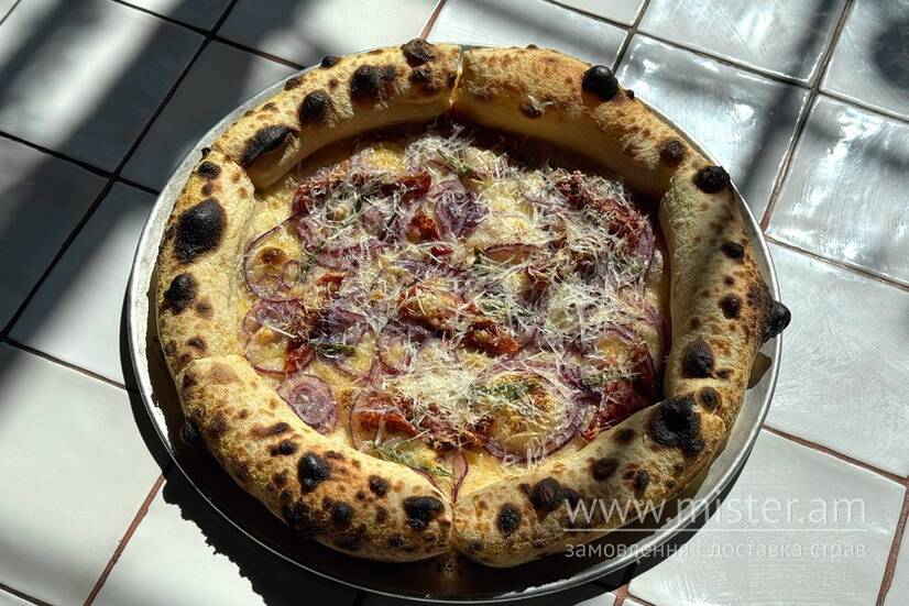 Італійський пшеничний коржик з в`яленими томатами, червоною цибулею та пряною оливковою олією.