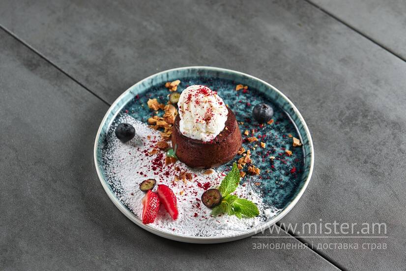 Французький шоколадний десерт з хрусткою скоринкою, рідкою шоколадною начинкою та базиліковим ганашем, подаємо з морозивом та сезонною ягодою.