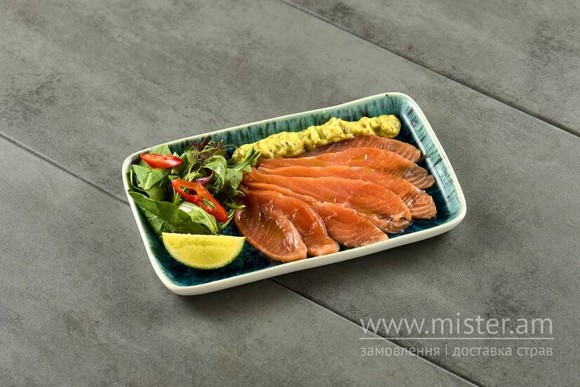 Лосось маринований в стружці тунця та спеціях хондаші, лаймовий соус, бебі мікс.