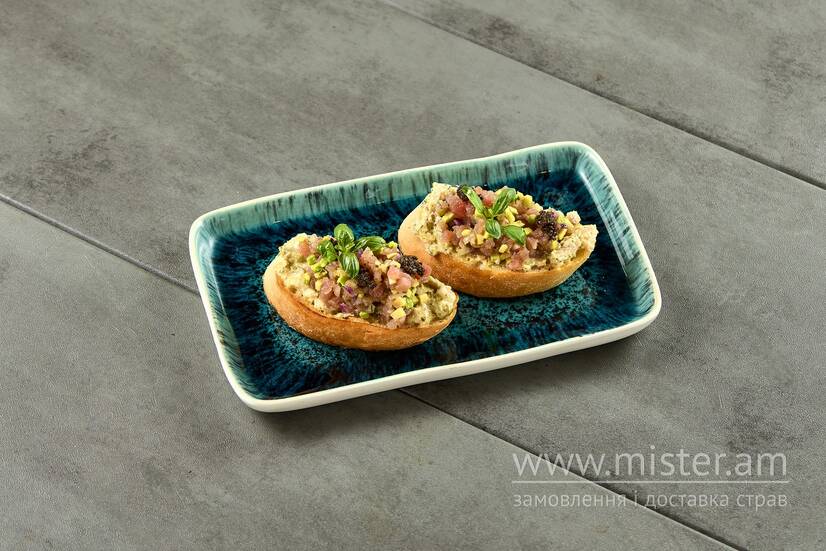 Хрумка, підсмажена на вершковому маслі чіабата, соус Тонато, тунець, авокадо, трюфельна паста, маринована цибуля.