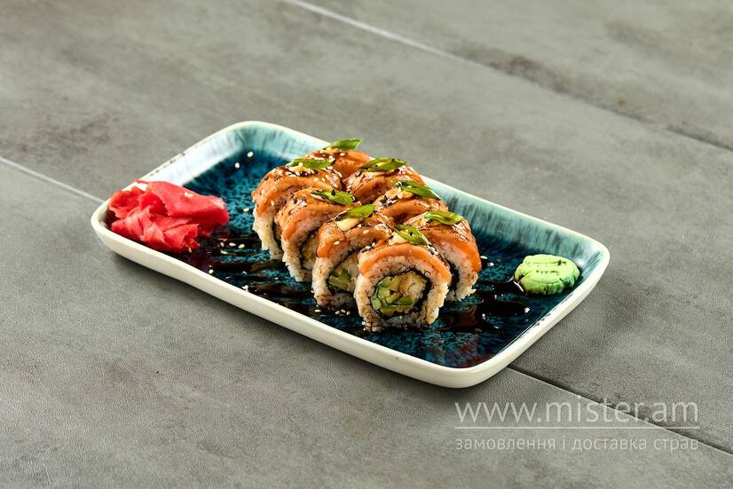 Рис, норі, креветка темпура, огірок, соус Айолі, лосось, Теріякі соус, кунжут, зелена цибуля.