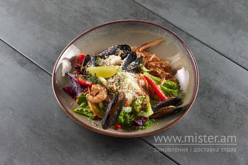 Бебі мікс, чері, болгарський перець, морква, креветки, кальмари, два вида мідій обсмажені на вершковому маслі з часником, сир Пармезан, соус Тайський та лаймова заправка.