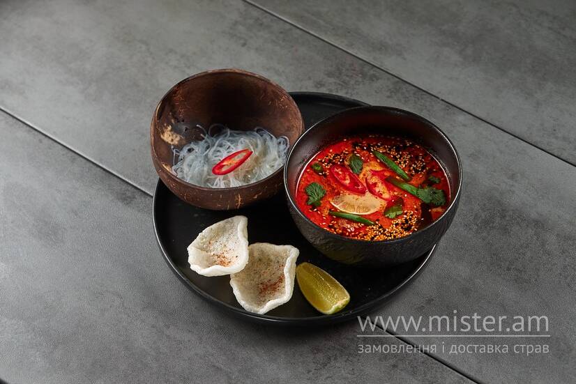 курячий бульйон, креветки, кальмари, печериці, чері, кокосове молоко, паста том ям, цибуля, лимонграс, листя кафіра, кінза, цибуля зелена, кунжут, лайм. Подається з фунчозою.