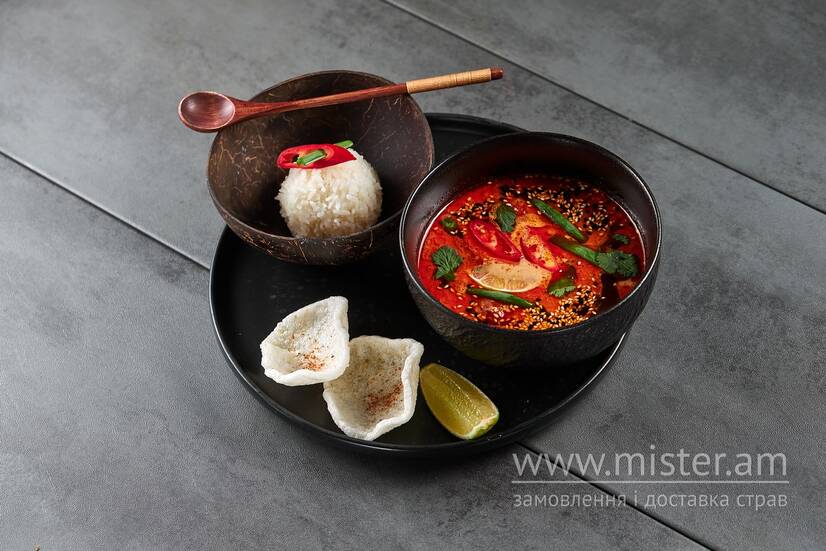 Курячий бульйон, креветки, кальмари, печериці, чері, кокосове молоко, паста том ям, цибуля, лимонграс, листя кафіра, кінза, цибуля зелена, кунжут, лайм. Подається з рисом.