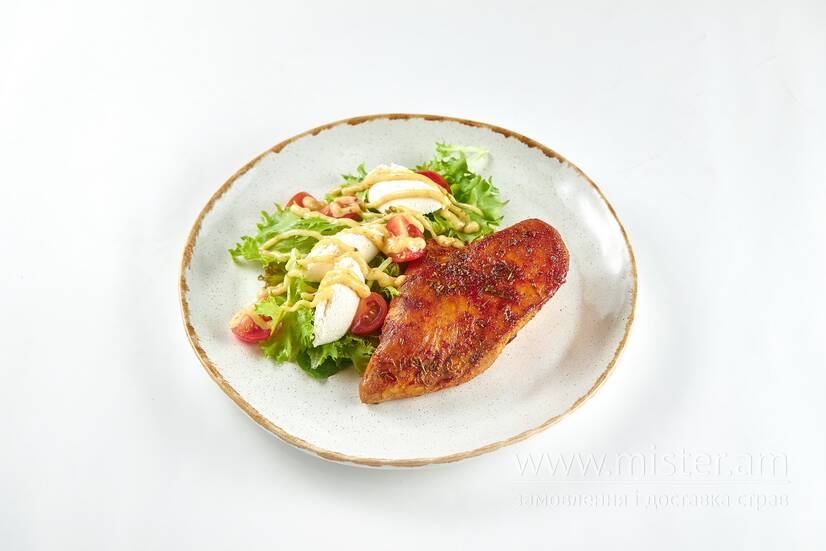 Котлета зі свинини з беконом, солоним огірком та вершковим соусом, картопляним пюре.