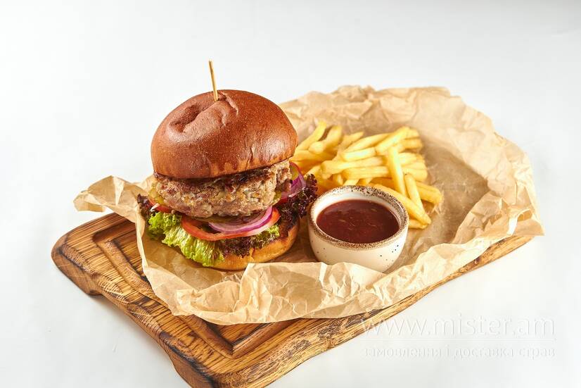 Булочка бріош, котлета з яловичини, цибуля, помідор, маринований огірок, листя салату, сир чедер.