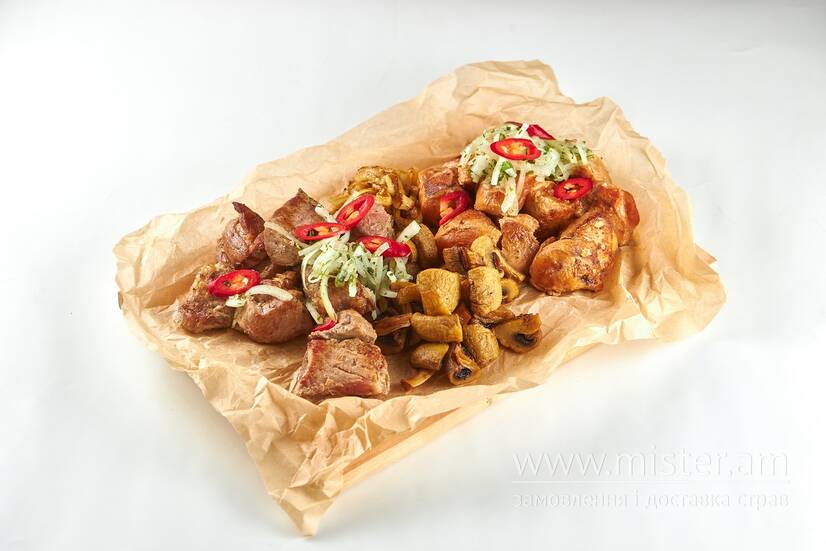Шашлик курячий, зі свинини, печериці, солодкий перець, кукурудза, соус барбекю.