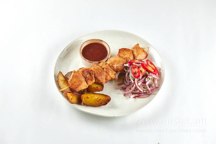 Шашлик з курятини, картопля по-селянськи, соус барбекю.