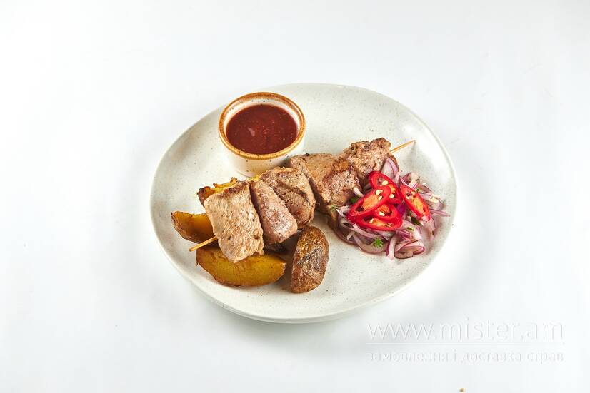 Шашлик зі свинини, картопля по-селянськи, соус барбекю.