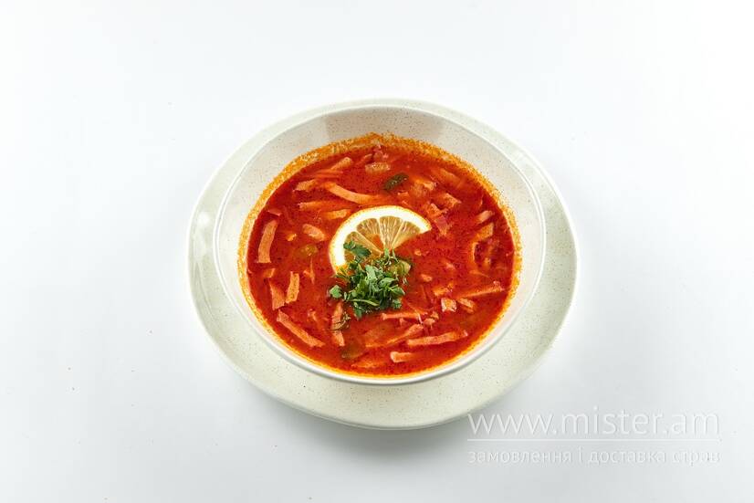 Томатний суп зі свининою та курятиною, шинкою, маринованим огірком, оливками та лимоном.