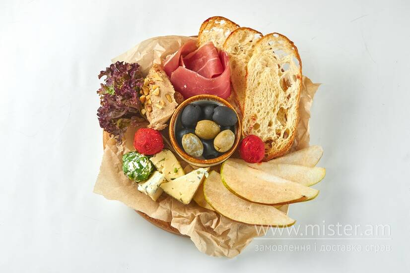 Паштет курячий, лабне, груша, прошутто, сир моцарела, дорблю, оливки.