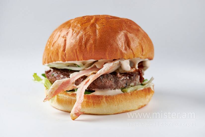 Бріош, котлета з мармурової яловичини, мікс салатів, смажений бекон, маринована цибуля, соус Ремулад.