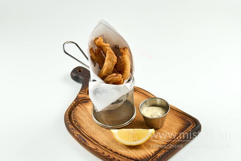 Філе тилапії у пивному клярі , соус тат тар, скибка лимону.