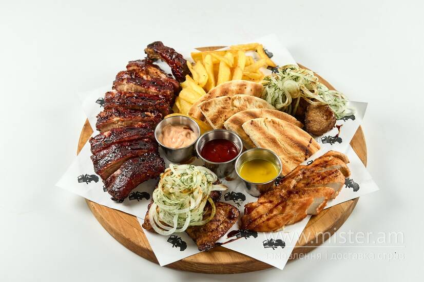 Шашлик з ошийка, шашлик з курячого стегна, курячий стейк на грилі, ребра пепер, картопляні діпи, маринована цибуля, соус Барбекю, соус Айолі.