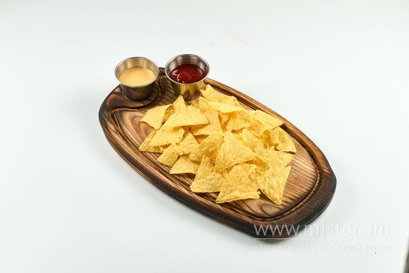 Кукурудзяні чипси начос, соус Барбекю, соус Чедер.