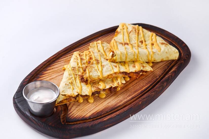 Тортилья, куряче стегно, ананас, сир моцарела, кукурудза, соус Барбекю, соус Чедер, сметана.