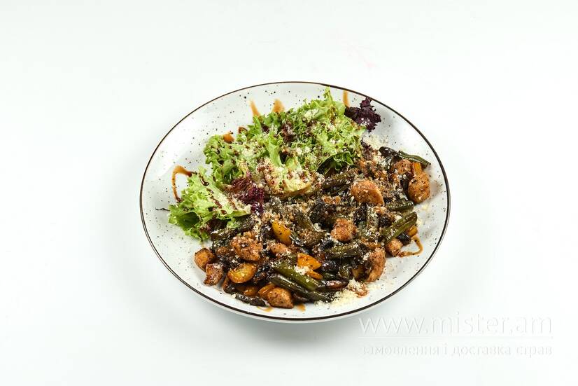 Мікс салатів, філе куряче, спаржа, печериці, перець солодкий, соєвий соус, соус Устричний, соус Бальзамічна карамель, сир пармезан.