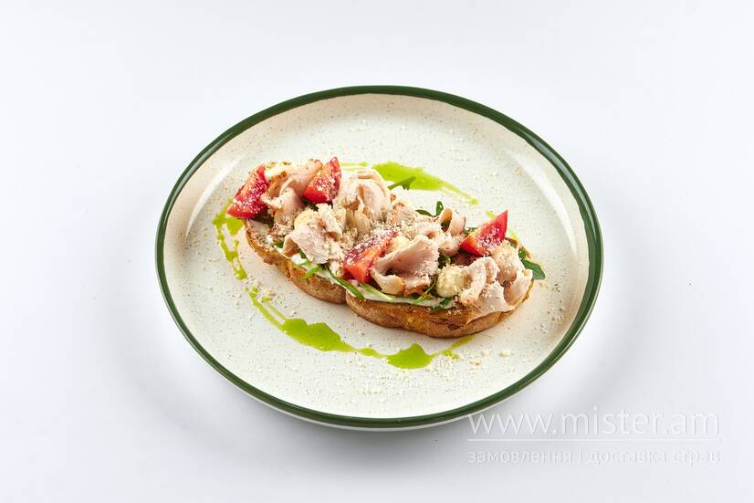 Крафтовий хліб, сир Лабне, рукола, помідори чері,соус Сaesar, Grano Podano, зелена олія.