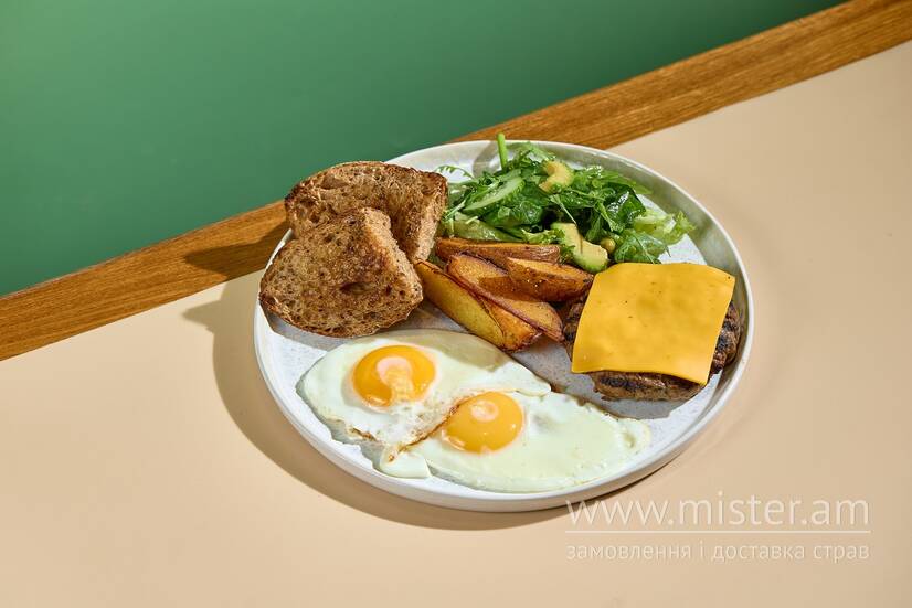 Біфштекс, крафтовий хліб, яйця, сир чеддер, зелений салат, копчене оливкове масло, картоля.