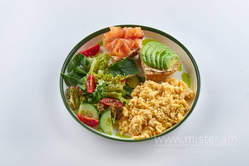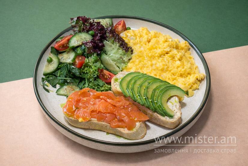 Авокадо, крафтовий хліб, мікс салатів, помідори чері, огірки, мус з філадельфії та солодкого чилі, лосось слабо солений, скремл або яйця варені на вибір.
