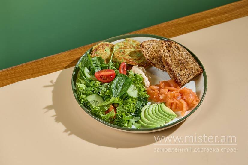 Авокадо, крафтовий хліб, зелений салат, помідори чері, мус з філадельфії та солодкого чилі, лосось слабо-солений, оладки з кабачка.