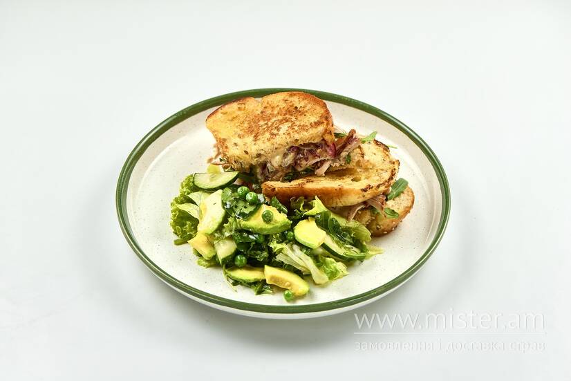 Зелений салат, хліб, пастрамі з індички, карамелізована цибуля, рукола.