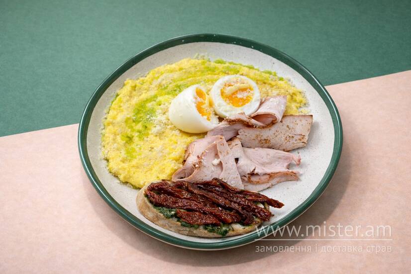 Полента зваране на молоці та вершках, пастрамі з індички, куряче яйце, сир пармезан, брускета з соусом песто та вялиними томатами.