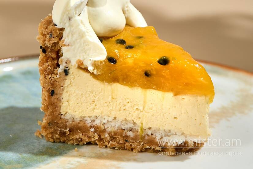 Ніжний манговий чизкейк на основі з пісочного тіста сабле і кокосу з кокосовим дакуазом та прошарком компоте манго маракуйя.