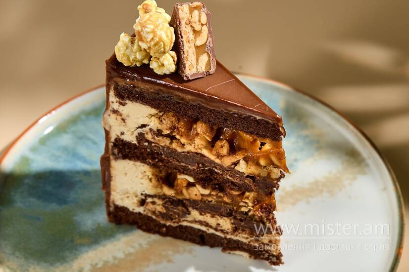 Соковиті шоколадні бісквіти, прошарок арахісу з карамеллю, прошарок мусу "а-ля Нуга" в шоколадно горіховій глазурі, шоколадний збитий ганаш, покриття ганашем на молочному шоколаді.