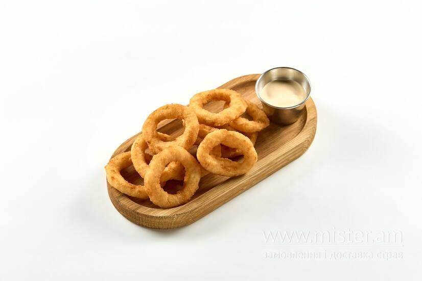 Цибулеві кільця, соус Cheddar.