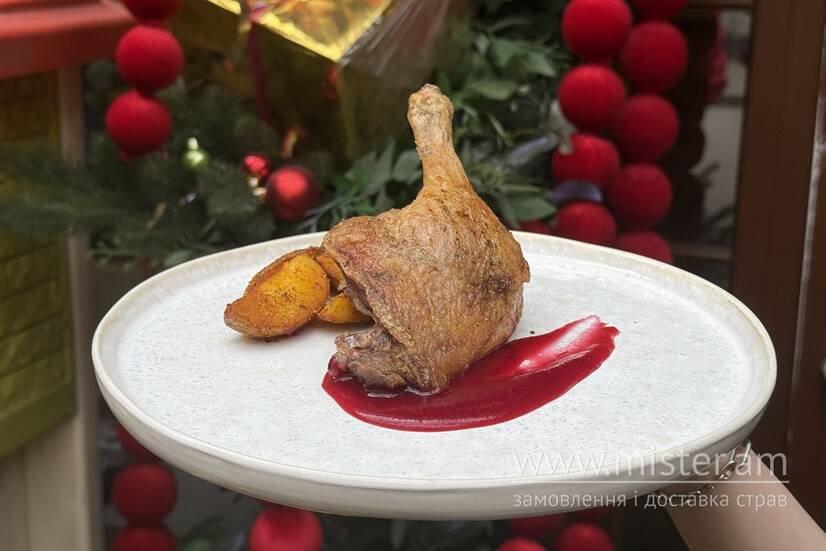 Куряча ніжка маринована в спеція, соус з журавлини, картопля.