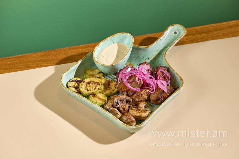 Ароматний ошийок з рум`яною скоринкою, поданий з печерицями та кабачком гриль, купажною цибулею та насиченим пряно-томатним соусом — яскраво і по-домашньому щедро.