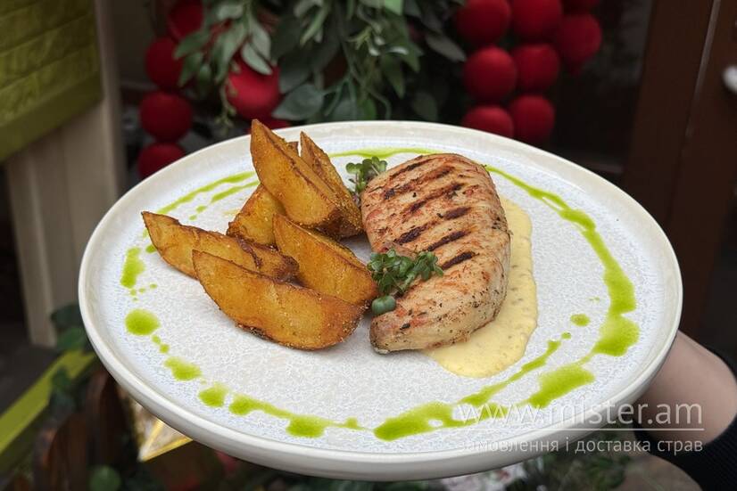 Курячий стейк маринований в спеціях, картопля, соус голандський, зелена олія.