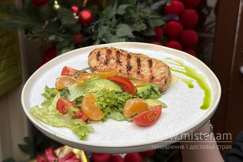 Курячий стейк маринований в спеціях, мікс салату,мандарини,помідори чері, соус голандський, зелена олія.