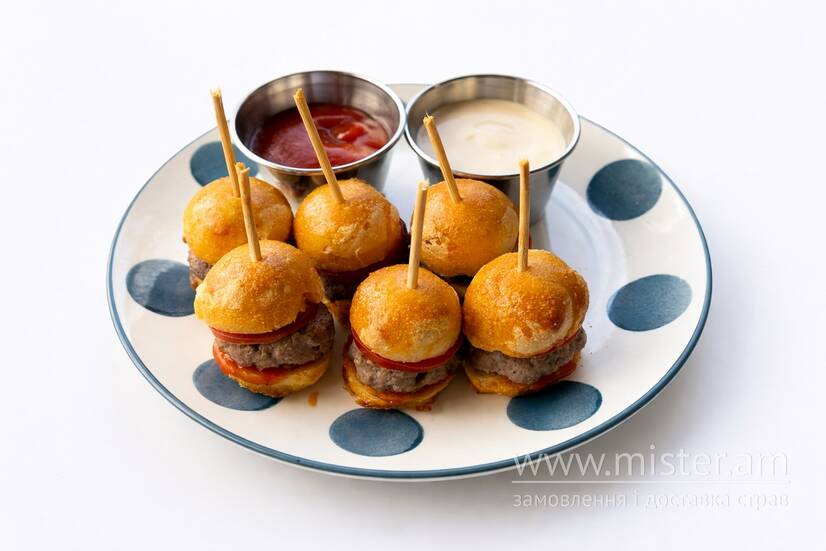 Набір маленьких м`яких булочок з ніжними телячими котлетками, соусом Чеддер і кетчупом – ідеально для дітей.