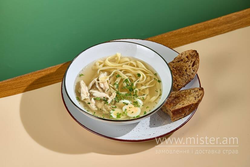 Прозорий курячий бульйон з тальятелле, соковитим курячим філе, перепелиним яйцем і зеленню. Легкий, зігріваючий і знайомий з дитинства.