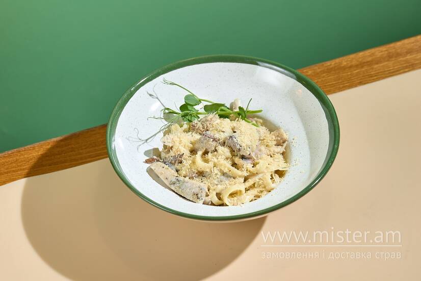Ніжна страва з білими грибами та курячим філе у вершковому соусі з часником і розмарином, доповнена сиром Grana Padano та свіжим базиліком.