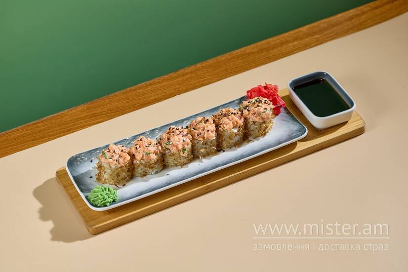 Сир Філадельфія, авокадо, стружка тунця, лосось, японський майонез із соусом спайсі, фурікакі та зелена цибуля.