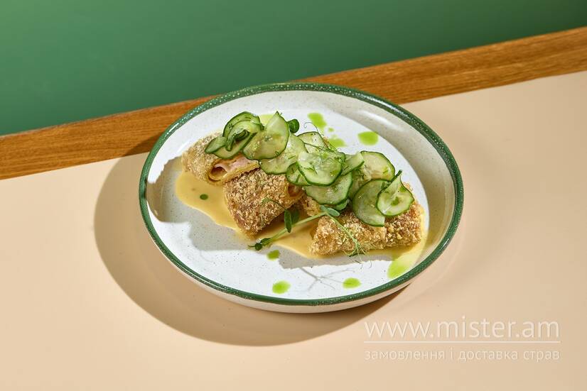 Шинка, сир Брі, соус Голландез, мариновані огірки.