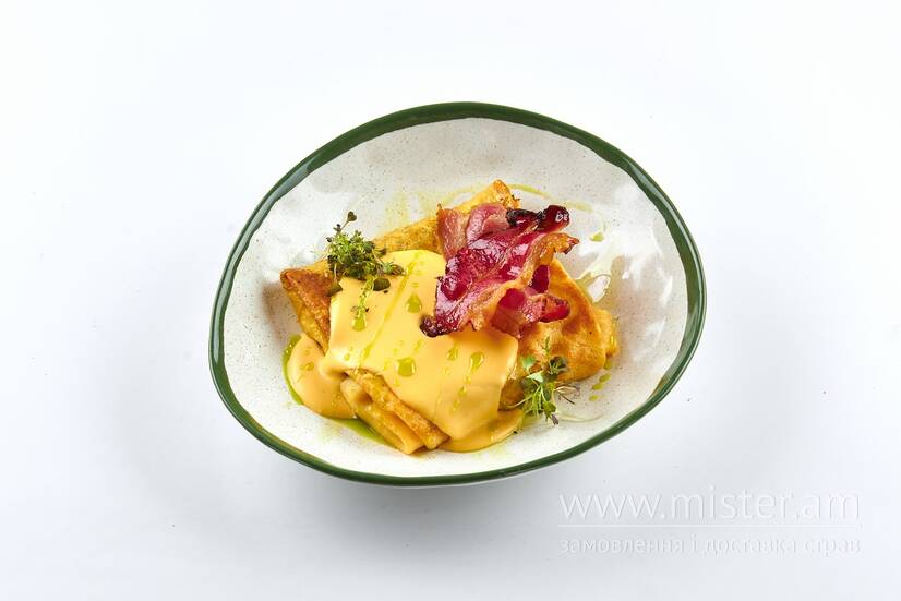 Печериці, куряче філе, цибуля, вершки,Mozzarella, бекон, соус голландський, зелена олія, мікрозелень.