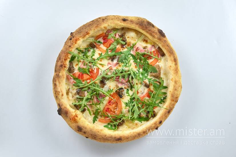 Ніжний соус Бешамель, моцарела, печериці та білі гриби, ароматний бекон, помідори та свіжа рукола – домашній італійський смак у кожному шматочку.