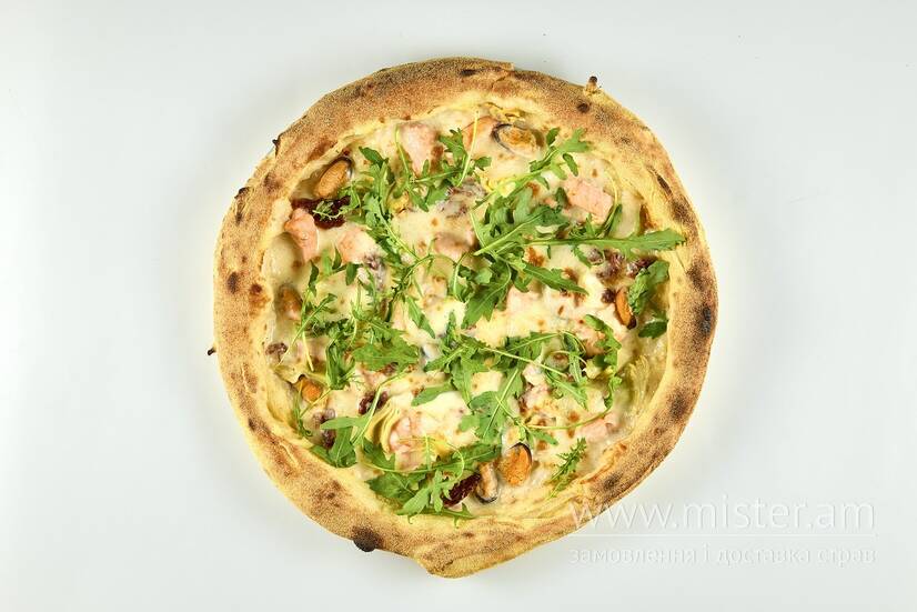 Соус Bechamel, Mozzarella, тигрова креветка, мідії, лосось, артишоки, в`ялені томати, рукола.