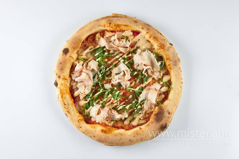 Соус Pomodoro, Mozzarella, куряче філе, свинина, пастрамі з індички, рукола, соус Cheddar.