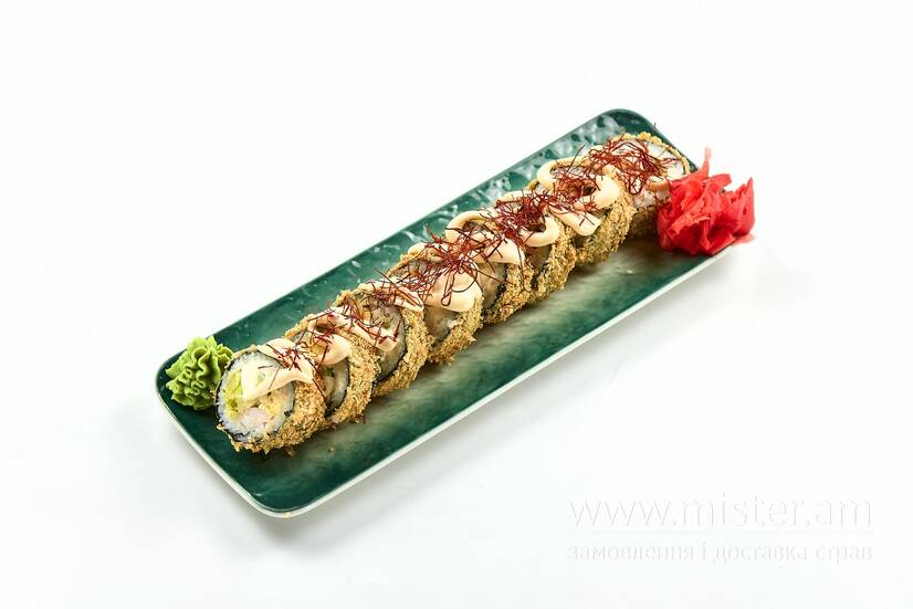 Креветка тигрова, сир Філадельфія, салат айсберг, омлет томаго,огірок, соус айолі, нитки чилі.