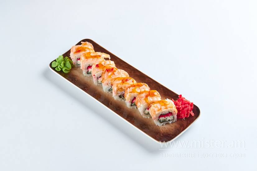 Тигрова креветка, сир Філадельфія, огірок, ікра тобіко.