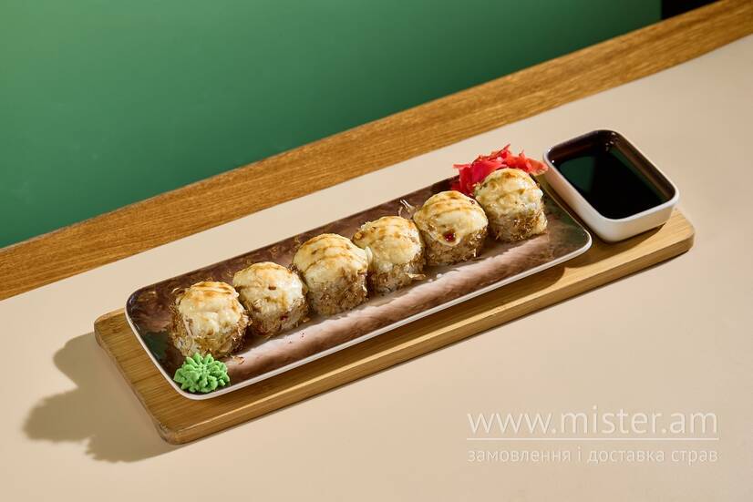 Лосось, ніжний краб, огірок, стружка тунця та сирна шапка.