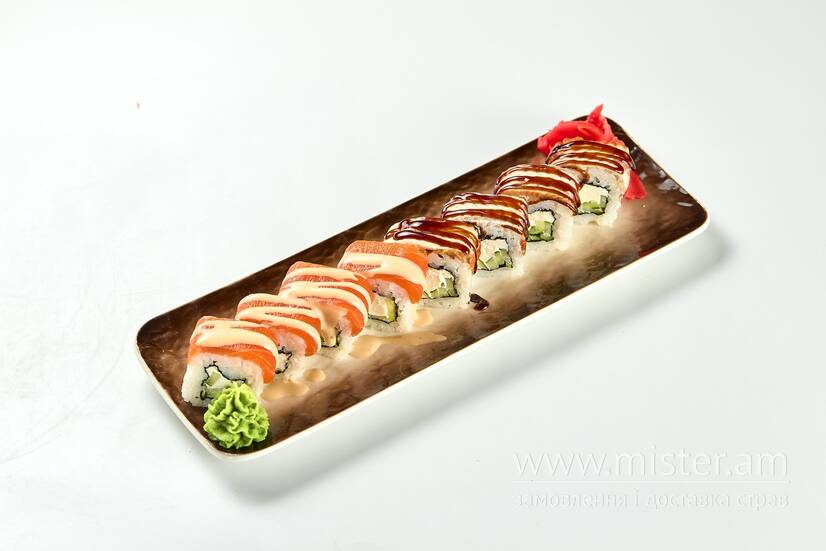 Свіжий лосось, вугор, сир Філадельфія, авокадо, огірок, японський майонез, соус теріякі.