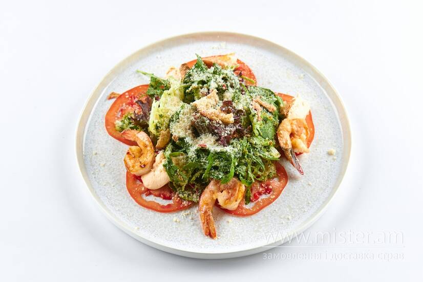 Мікс салатів, соус Pesto, помідори, крабовий кранч, тигрова креветка, мус з сиру Філадельфії та соусу світ чилі, Grana Padano.